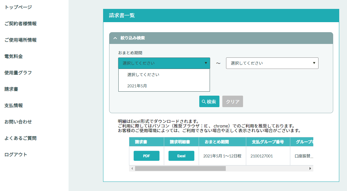 ※初回のご請求が行われるまで、該当のメニューは表示されません。またシステムリニューアルをした為、2021年4月以前の情報は確認いただけません。